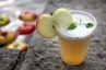 Knus en myntestængel i et glas med en ske. Blend most og isterninger og fordel det i glassene. Pynt med æbleringe og mynteblade.